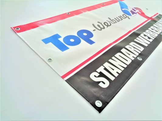 - BANER STANDARDOWY – MOCNY grubość tego baneru to 510g. Jest na prawdę mocny dodatkowo dzięki wysokiej jakości druku – świetnie reprezentuje naszą firmę. Pamiętajmy że grafikę na banerach powinno się oglądać z kilku/ kilkunastu metrów. Banery standardowe drukujemy w jakości 1080dpi. Dodatkowo mają wzmocnienie w postaci zgrzewu i oczek nabijanych maszynowo – dzięki czemu są one bardzo trwałe. Standardowy baner najlepiej montować na ścianach, płotach jednak w miejscach które nie są mocno wietrzne (w przeciwnym razie lepiej wybrać baner siatkowy) czy na konstrukcjach / tablicach które mają wypełnienie (nie samą ramę).